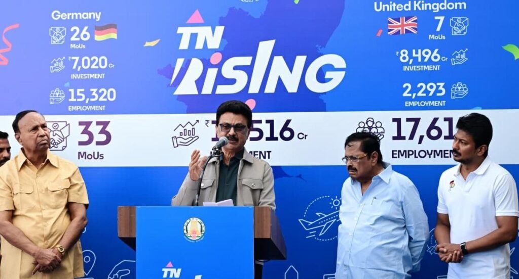 ஜெர்மனி மற்றும் பிரிட்டனுக்கான தனது அதிகாரப்பூர்வ பயணத்தின் போது, ₹15,516 கோடி மதிப்பிலான முதலீடுகளை ஈர்க்கும் வகையிலும், 17,613 பேருக்கு வேலைவாய்ப்பு வழங்கும் வகையிலும் மொத்தம் 33 புரிந்துணர்வு ஒப்பந்தங்கள் கையெழுத்திடப்பட்டுள்ளதாக தமிழக முதல்வர் மு.க. ஸ்டாலின் (செப்டம்பர் 8, 2025) தெரிவித்தார்.